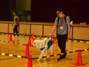 授業後には体育館に移動し、「目隠し歩行体験」と「盲導犬の実演歩行」を行いました。実際に目隠しをして歩いてみる体験を通じて、視覚に頼らず歩く不安で「怖い」と言う声がたくさん上がっていました。その後、僕と盲導犬で皆さんが体験したコースを実演歩行しました。盲導犬の動きの正確さに「おぉ!」「すごい!」と驚く声がたくさん上がりました。